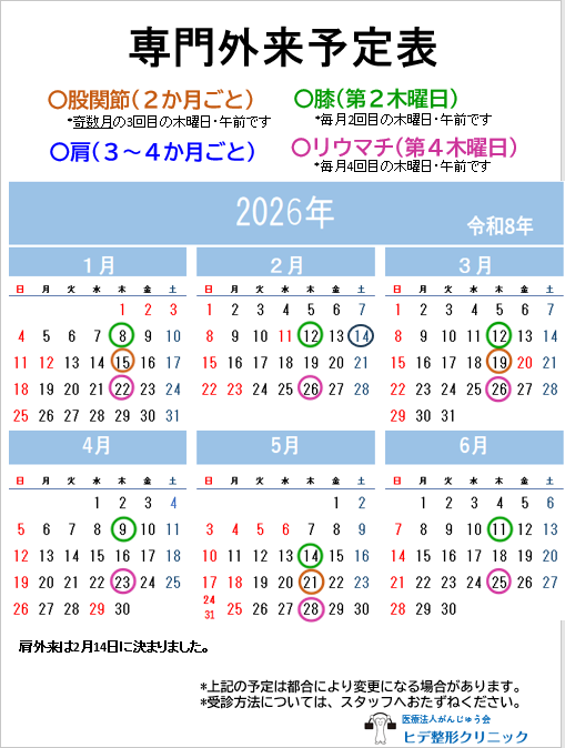 専門外来のお知らせ(股関節・膝・肩・リウマチ)
